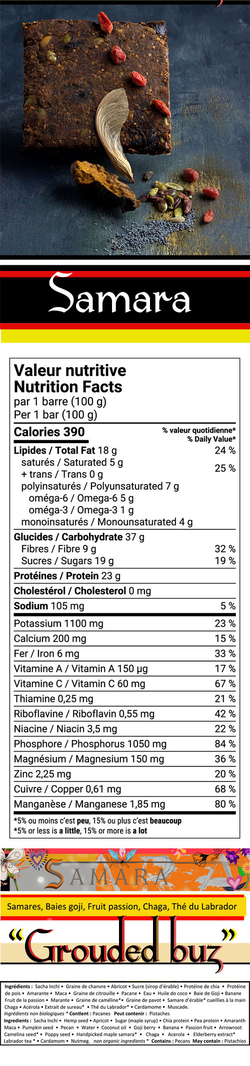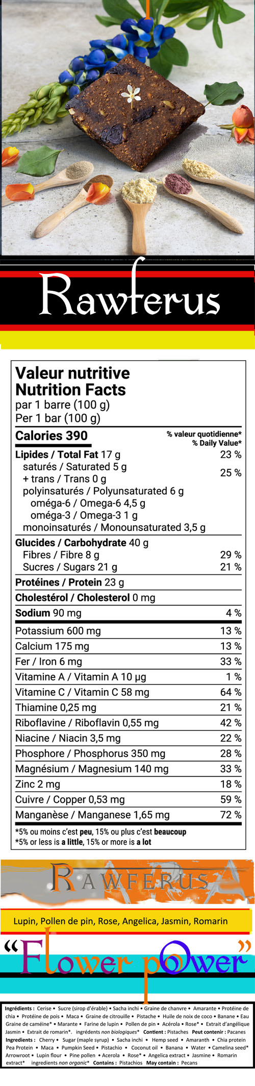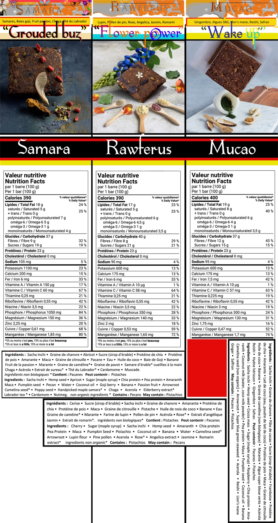 Fairyman snack bars are highly nutritious, made with twenty rare quality superfoods. They come in three flavors; cherry-pistachio, apricot-pecan and raspberry-chocolate-ginger, and are cooked locally and artisanally in Sainte-agathe-des-Monts, Quebec, Can.