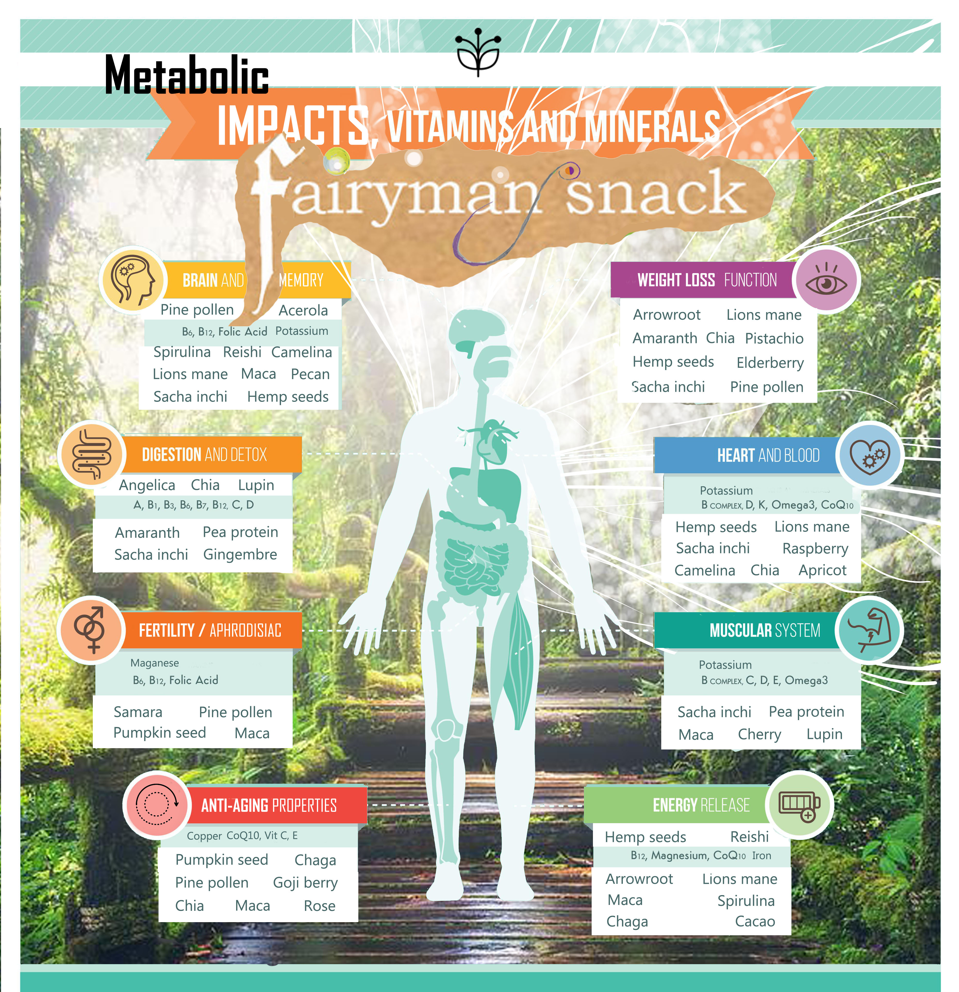 Fairyman snack bars also stimulate the mind with ingredients such as pine pollen, reishi, lion’smane, maca, chaga and spirulina, to name a few. The overall antioxidant property ratio is also very high.